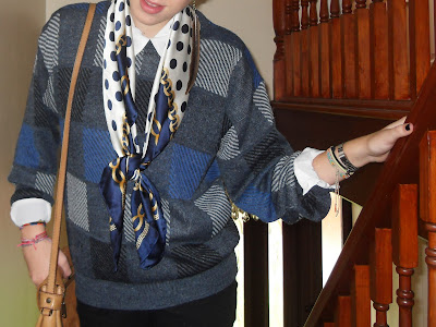 White under shirt- Charity shop £3... Man's oversized striped jumper- Charity shop £2.50... Spotted contrasting scarf- Primark £2... Bag- Charity shop £2.50... Feather Earring- Primark £2.50... Jeans- Primark £9...
